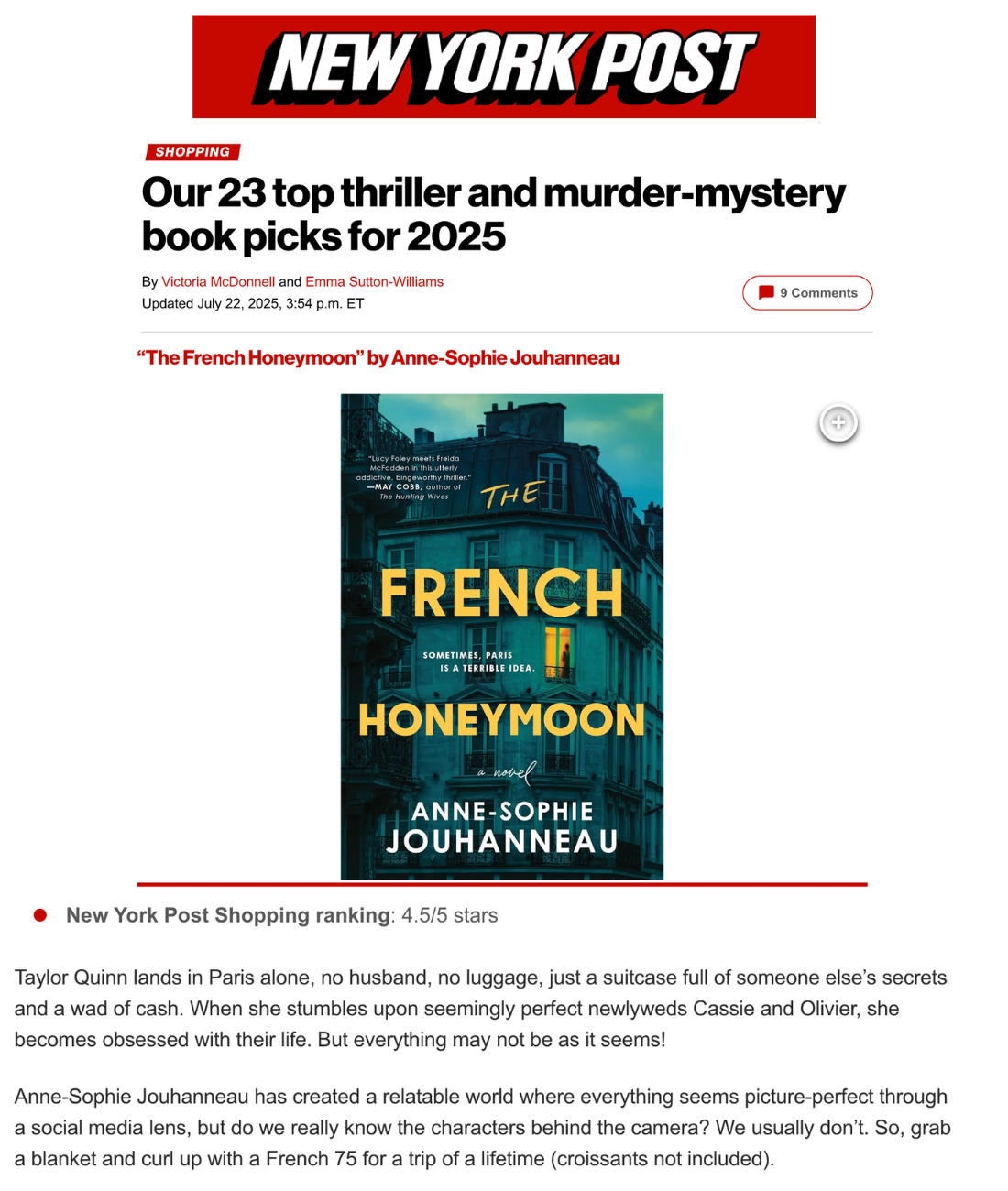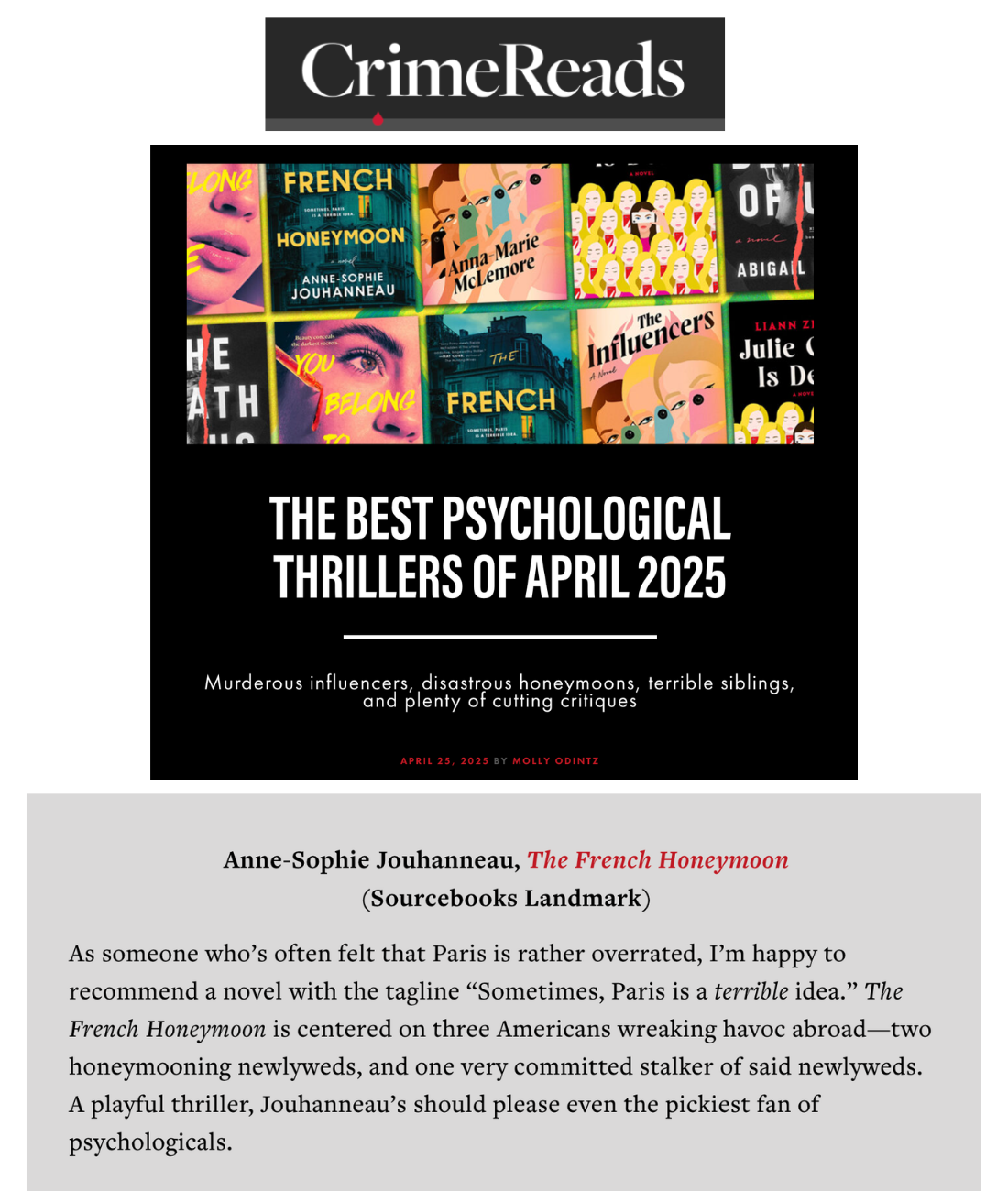 “The City of Love takes on a sinister new light in The French Honeymoon, Anne-Sophie Jouhanneau’s riveting suspense . This clever twist on the domestic thriller doubles as a mordant tale of obsession, greed, and betrayal, guaranteed to shock you and keep you turning pages long into the night. Francophiles and fans of love gone wrong: prepare to eat this up.”